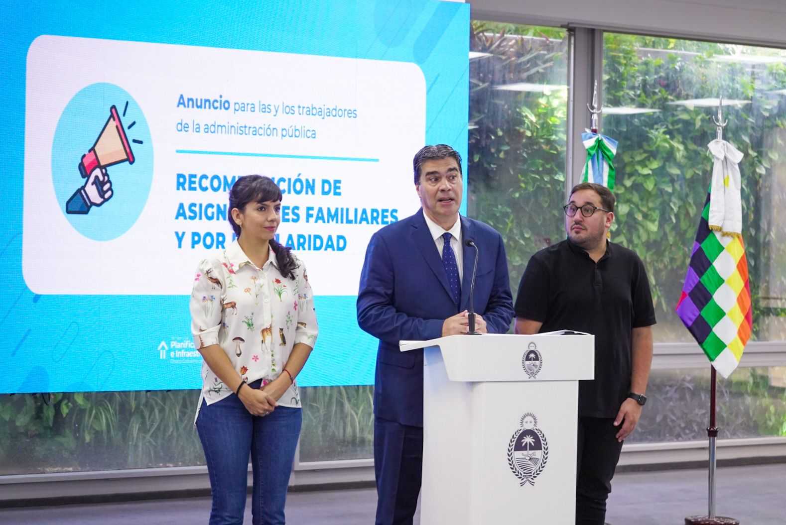 El gobernador Jorge Capitanich, junto a la vicegobernadora Analía Rach Quiroga, el ministro de Planificación, Economía e Infraestructura, Santiago Pérez Pons, anunció este miércoles la recomposición de las asignaciones familiares y escolares. De esta manera, el mandatario anunció que desde el 1 de marzo “se duplican las asignaciones por hijo y se aumenta más del 100% los topes de salario que determina cada categoría”. El gobernador dijo que “hoy cada hijo percibe 1.500 pesos y pasariamos a tener una percepción de 3000 pesos. Para los hijos con discapacidad, pasan de 6 mil a 12 mil pesos “.