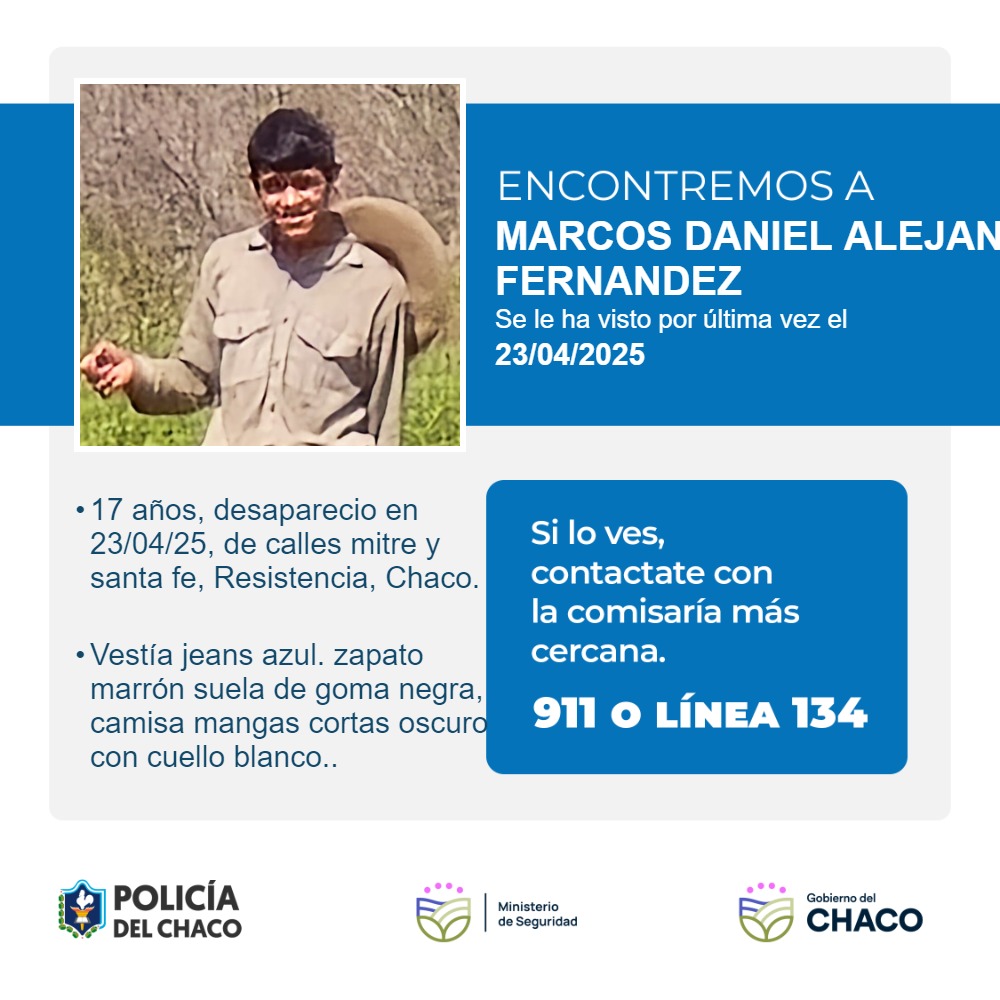 La Policía del Chaco en base a una denuncia registrada en Comisaria Decima, solicita a la comunidad su valiosa colaboración de informar a la unidad policial más cercana cualquier información relacionada al paradero de el menor MARCOS DANIEL ALEJANDRO FERNANDEZ, de 17 años, de 1,70 metros de altura, de contextura física delgada, tez morena, cabello lacio negro, ojos color marrones ,usando la siguiente vestimenta y/o efectos personales: vestía jeans azul. zapato marrón suela de goma negra, camisa mangas cortas oscuro con cuello blanco. Se le ha visto por última vez en Calles Mitre Y Santa Fe en fecha 23/04/2025.