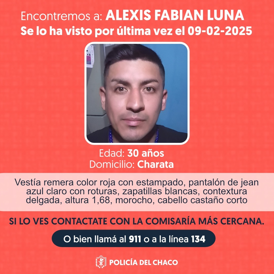 La Policía del Chaco en base a una denuncia registrada en División Violencia Familiar Y De Genero Interior Charata, solicita a la comunidad su valiosa colaboración de informar a la unidad policial más cercana cualquier información relacionada al paradero de ALEXIS FABIAN LUNA, de 30 años, de 1,68 metros de altura, de contextura física delgada, tez morocho, cabello , ojos color ,usando la siguiente vestimenta y/o efectos personales: vestía remera color roja con un estampado, pantalon de jean azul claro con roturas y zapatillas blanca Se le ha visto por última vez en Charata en fecha 09/02/2025.