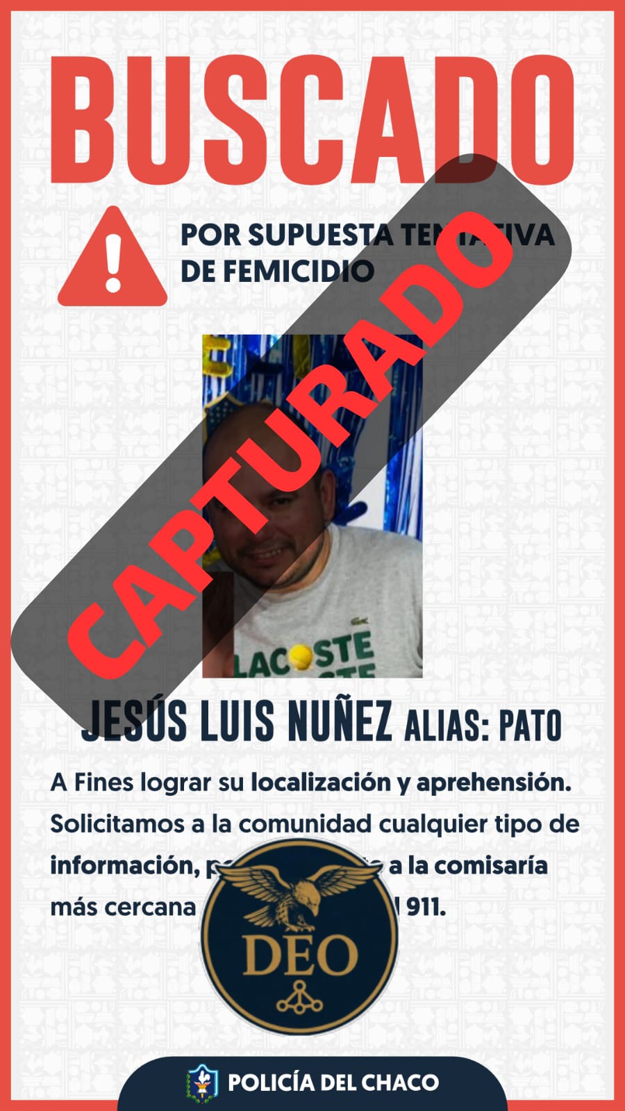 El sujeto era buscado como presunto autor de una tentativa de femicidio. Fue atrapado en la Chacra 24-barrio Nalaa de la ciudad de Resistencia.