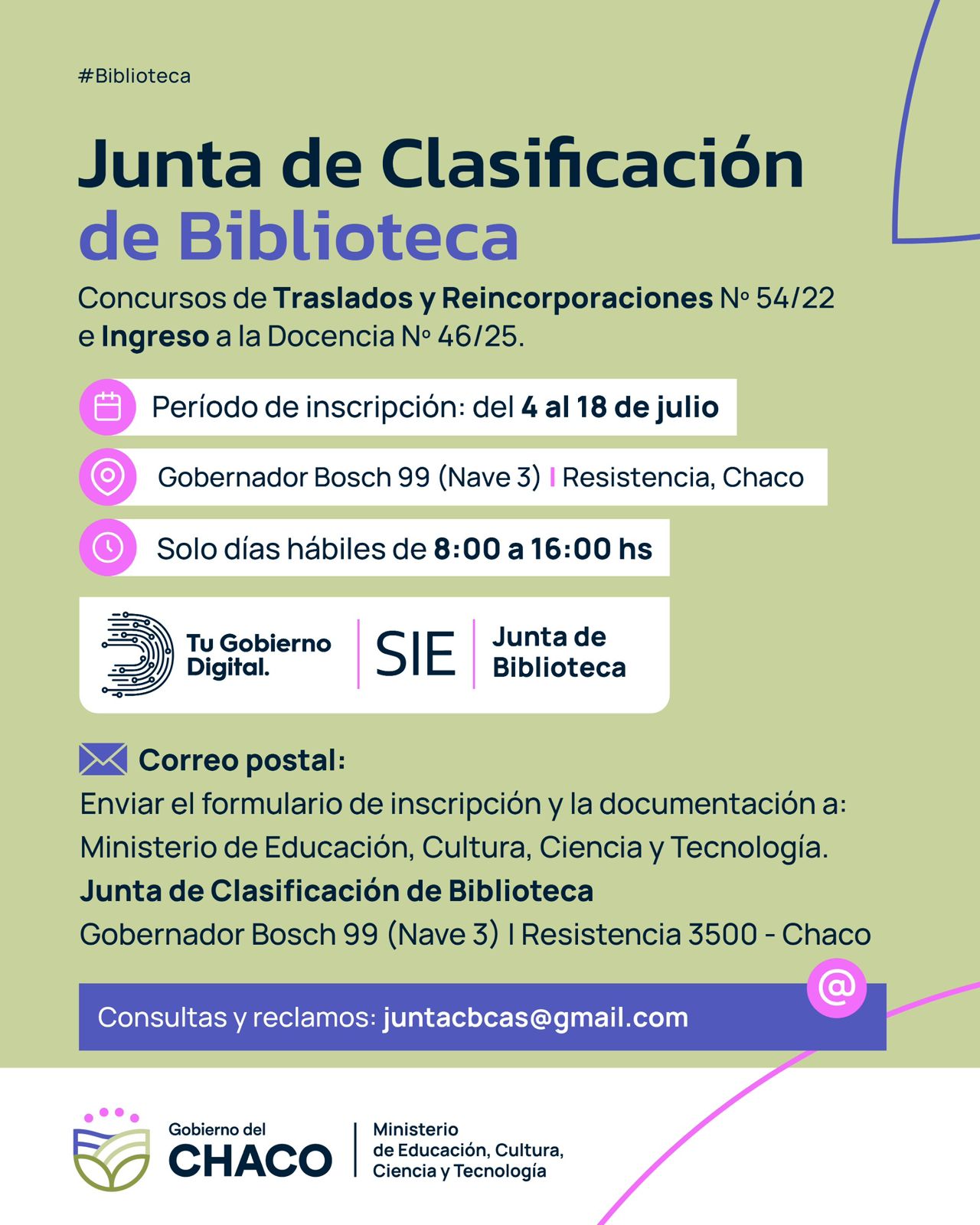 Exhibición de resolución y cargos vacantes: en Tu Gobierno Digital – SIE– Juntas – Listas vigentes; en la sede de Junta de Clasificación de Biblioteca y en todas las direcciones regionales y subsedes educativas de la provincia. Por consultas o reclamos, escribir a juntacbcas@gmail.com