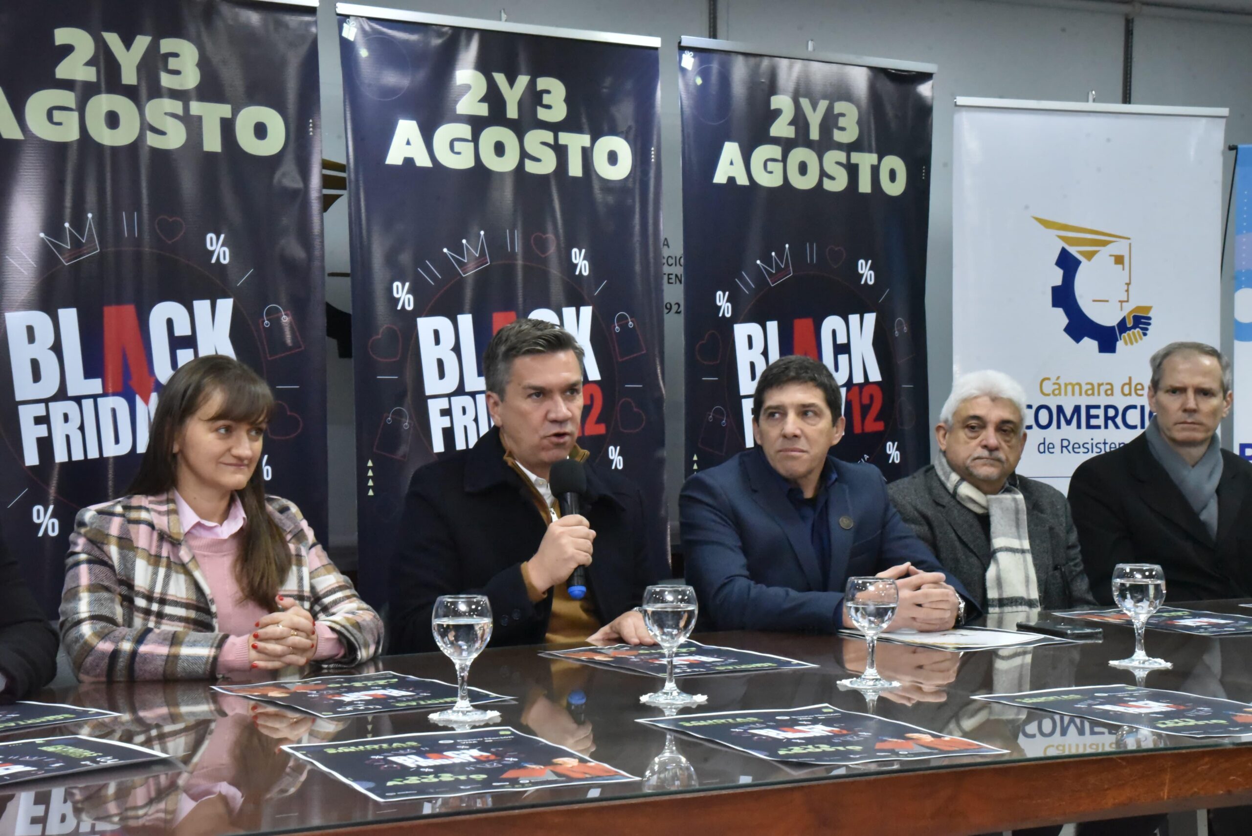 *EL 2 Y 3 DE AGOSTO VUELVE EL BLACK FRIDAY A RESISTENCIA: “ES UN BENEFICIO PARA EL COMERCIO Y PARA TODA LA GENTE”, DIJO EL GOBERNADOR ZDERO*_El gobernador Leandro Zdero acompañó hoy el anuncio de una nueva edición de la iniciativa que trae promociones en comercios de todos los rubros, gastronomía, hotelería y turismo. Habrá cuotas sin intereses con tarjeta Tuya (Nuevo Banco del Chaco) y Visa y Mastercard (Banco Nación)._*La 12° edición del Black Friday será el viernes 2 y sábado 3 de agosto, con promociones en comercios de todos los rubros, gastronomía, hotelería y turismo. Habrá cuotas sin intereses con tarjeta Tuya (Nuevo Banco del Chaco) y Visa y Mastercard (Banco Nación).*La iniciativa, anunciada en conferencia de prensa en la Cámara de Comercio de Resistencia, busca impulsar las ventas a través de rebajas, descuentos y ofertas en comercios de todos los rubros. “Es un evento que moviliza la economía; es importante acompañar al sector privado en estos momentos difíciles para que a Chaco le vaya mejor”, valoró el gobernador. Este año la propuesta incluye compras en todos los rubros con 6 cuotas sin interés (10,70 % CF, acreditación a las 48 horas hábiles); y para el rubro de Bares y Restó, 3 cuotas sin interés (5 % CF, acreditación a las 48 horas hábiles). Las promociones serán con tarjeta Tuya del Nuevo Banco del Chaco y las tarjetas Visa y Mastercard del Banco Nación.Zdero destacó la posibilidad de ofrecer productos de todos los rubros con descuentos y facilidades de pago a la comunidad. “Es un beneficio no sólo para el comercio sino para toda la gente, la activación del comercio es generadora de trabajo, mano de obra, y más inversiones”, remarcó.Para ello remarcó la importancia del trabajo coordinado entre el Ministerio de Producción y Desarrollo Económico Sostenible y las distintas Cámaras de Comercio de toda la provincia. “Trabajamos ofreciendo alternativas para atravesar este momento difícil; tenemos que acompañar a quienes son el motor económico de la provincia”, aseguró. El primer mandatario provincial estuvo acompañado por la vicegobernadora Silvana Schneider, el secretario de Coordinación de Gabinete Livio Gutiérrez; el ministro de Producción Hernán Halavacs; la secretaria de Cultura y Turismo De la Muni de Resistencia Barbara Losch; el presidente del NBCH Eric Germán Dahlgren; el gerente Comercial Banco Nación Nestor Meister; la presidente del Instituto de Turismo Verónica Mazzaroli y el vicepresidente de esa entidad Martín Braillard Poccard; el presidente del Instituto de Cultura Mario Zorrilla; el presidente Cámara de Comercio Resistencia Walter Bistman; el diputado Carlos Salom.*Impulsar el consumo*El presidente del NBCh Germán Dalhgren, valoró la importancia de las promociones para sostener, mantener y aumentar el consumo. “Venimos acompañando con programas con resultados muy buenos; seguiremos manteniendo el trabajo coordinado con las cámaras de comercio, para atender las necesidades y lanzar promociones en función de los requerimientos que surgen desde las cámaras”, aseguró. En tanto, el gerente Comercial Banco Nación, Néstor Meister, valoró la posibilidad de acompañar la nueva edición del Black Friday, con 6 cuotas sin interés con las tarjetas Visa y Mastercard. “Queremos estar presente en esta promoción acompañando las iniciativas de las cámaras para la evolución del sector comercial de la ciudad”, aseguró. Por último, el presidente de la Cámara de Comercio de Resistencia Walter Bitsman precisó que “es el evento comercial más importante de la ciudad que atraerá visitantes a la capital provincial”. *Black friday*El Black Friday es un evento comercial que crece año tras año y que tiene por objetivo incentivar las ventas atrayendo a clientes de la ciudad y de la región. Es el resultado de un trabajo articulado entre el sector público y el privado para impulsar las economías regionales y promover el turismo local, activar la gastronomía, los servicios y el comercio en general de la ciudad de Resistencia.