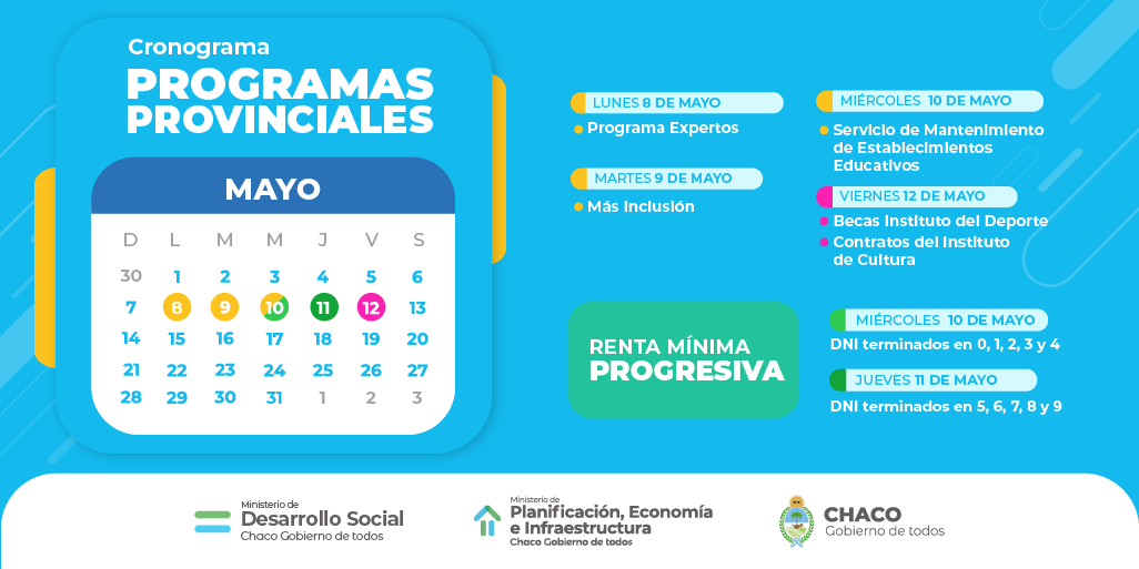 El Ministerio de Planificación, Economía e Infraestructura informó el cronograma de pagos de programas provinciales, que se iniciará el próximo lunes 8 con el pago a las y los beneficiarios de los programas Expertos, dependientes del Ministerio de Salud Pública. Un día después, es decir el 9, cobrarán personas beneficiarias de Más Inclusión, del Ministerio de Desarrollo Social.