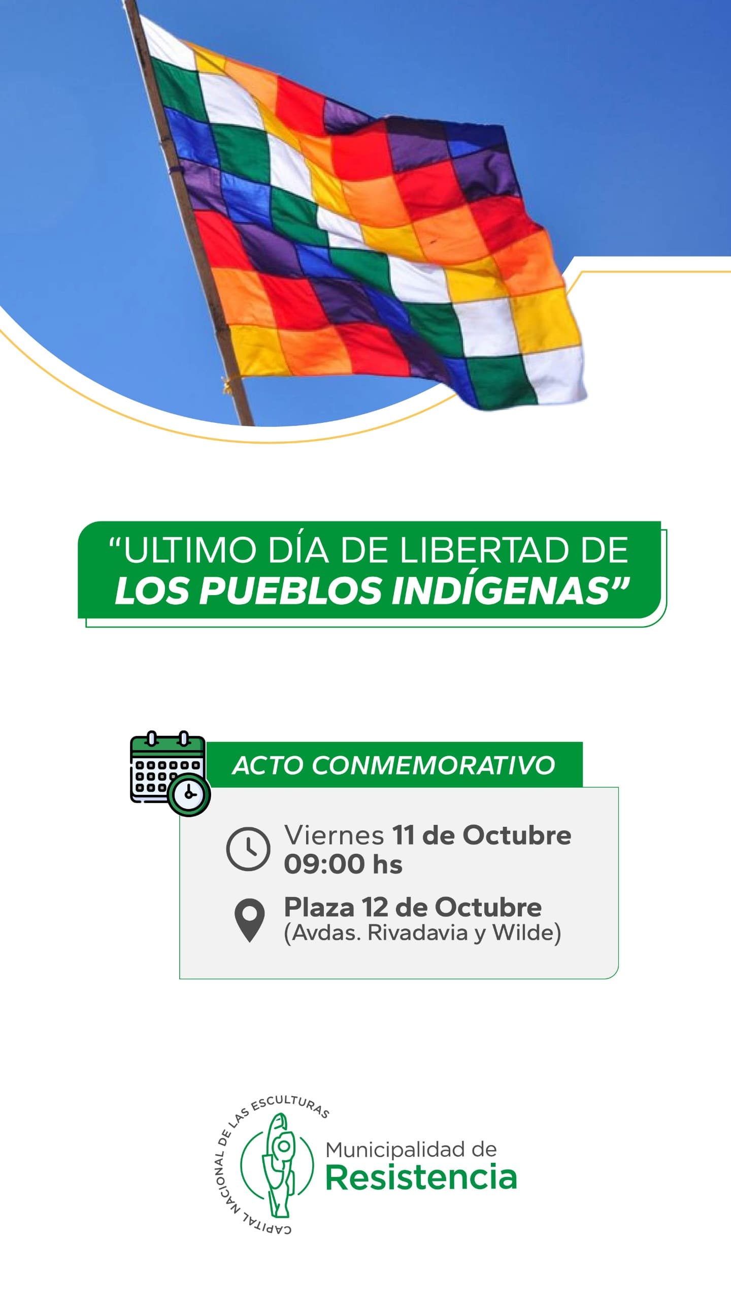 El viernes 11 de octubre, a las 9 horas, en la Plaza 12 de Octubre, por el “Último día de libertad de los pueblos indígenas” se realizará el izamiento y el acto oficial en el que se entonara el Himno Nacional, ejecutado por la Banda de Música Municipal, en Castellano y Qom. Además, se hará una bendición de las actividades a cargo de un anciano de la comunidad.