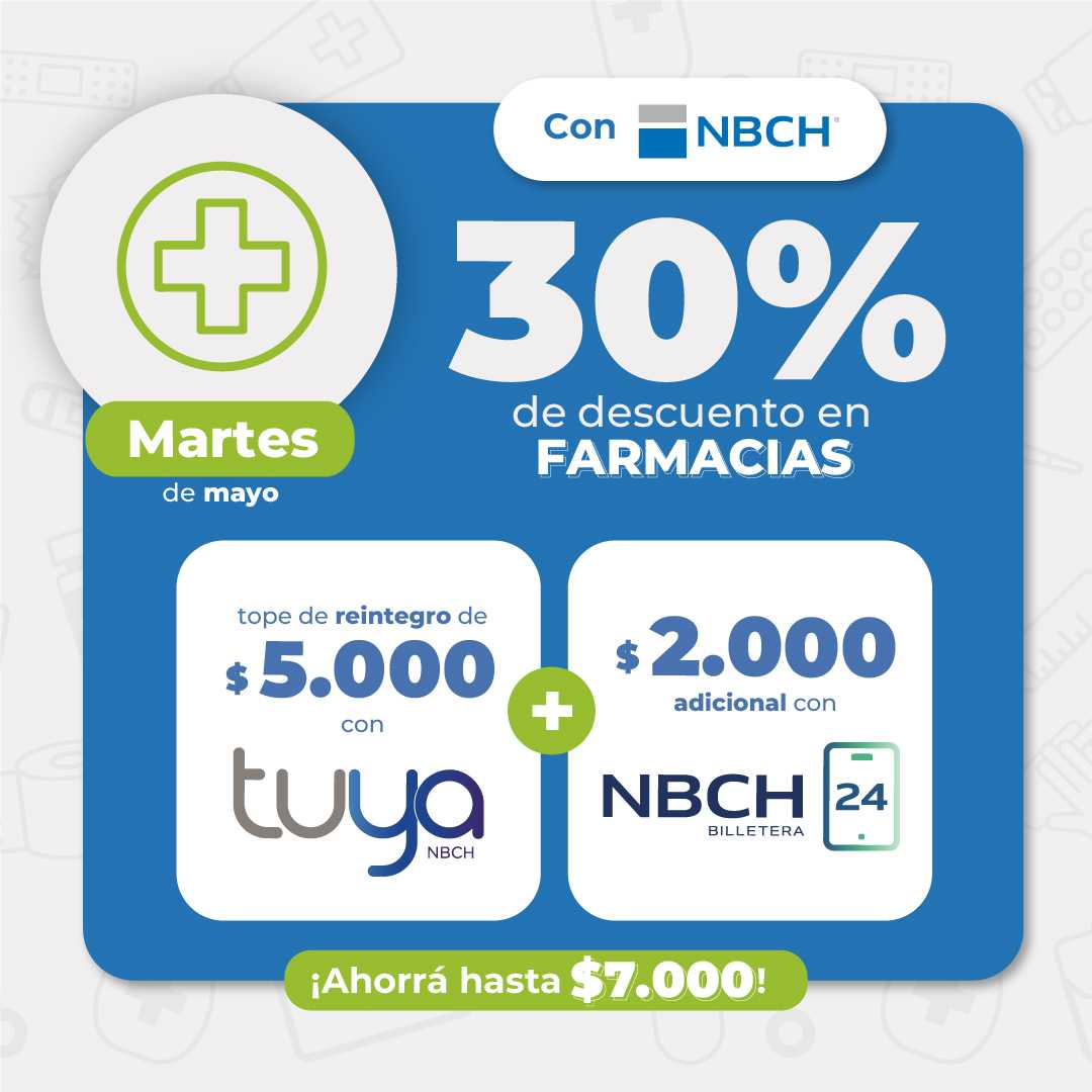 De esta forma, este martes 9 de mayo será día de descuentos en Farmacias, con una bonificación del 30%, con un tope de reintegro de $5.000, en un pago, con todos los tipos de Tarjeta Tuya, y de $2.000 para pagos con Billetera NBCH24, lo que implica un ahorro de $7.000 por mes.