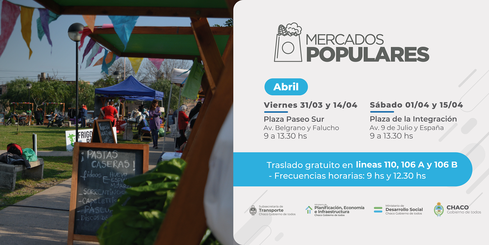Esta medida se implementa en las líneas 106 A y 106 B, cuyas unidades se identificarán con el cartel “Mercados Populares”. Las mismas trasladarán de forma gratuita a las personas que se dirijan a Plaza Paseo Sur (Av Belgrano y Falucho) los días viernes 31 de marzo y 14 de abril, como también a quienes quieran concurrir el sábado 1 de abril y sábado 15 en la Plaza de la Integración, (avenida 9 de Julio y España). El servicio tendrá dos frecuencias, a las 9 y a las 12:30.