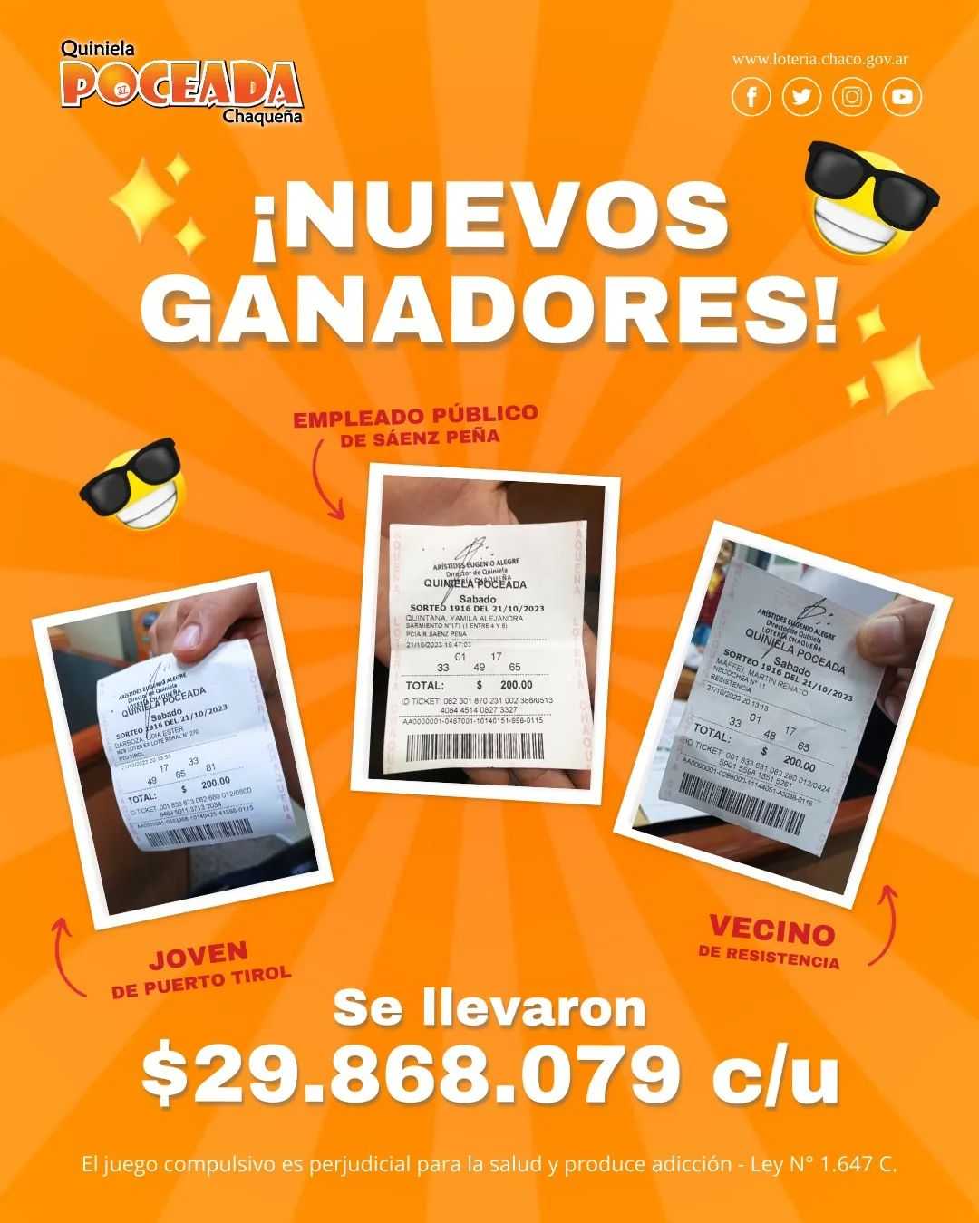 De esta manera, se repartieron un premio de $89.604.237, uno de los más importantes de la Quiniela Poceada durante este año, según informaron desde las redes de Lotería Chaqueña. Así, cada uno de ellos se llevó una suma total de $29.868.079.