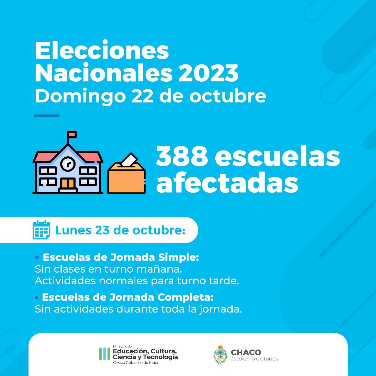 El Ministerio de Educación, a través de la Dirección General de Gestión Educativa, informa que 388 establecimientos escolares de toda la provincia estarán afectados a las elecciones nacionales, que se desarrollarán este domingo 22 de octubre.