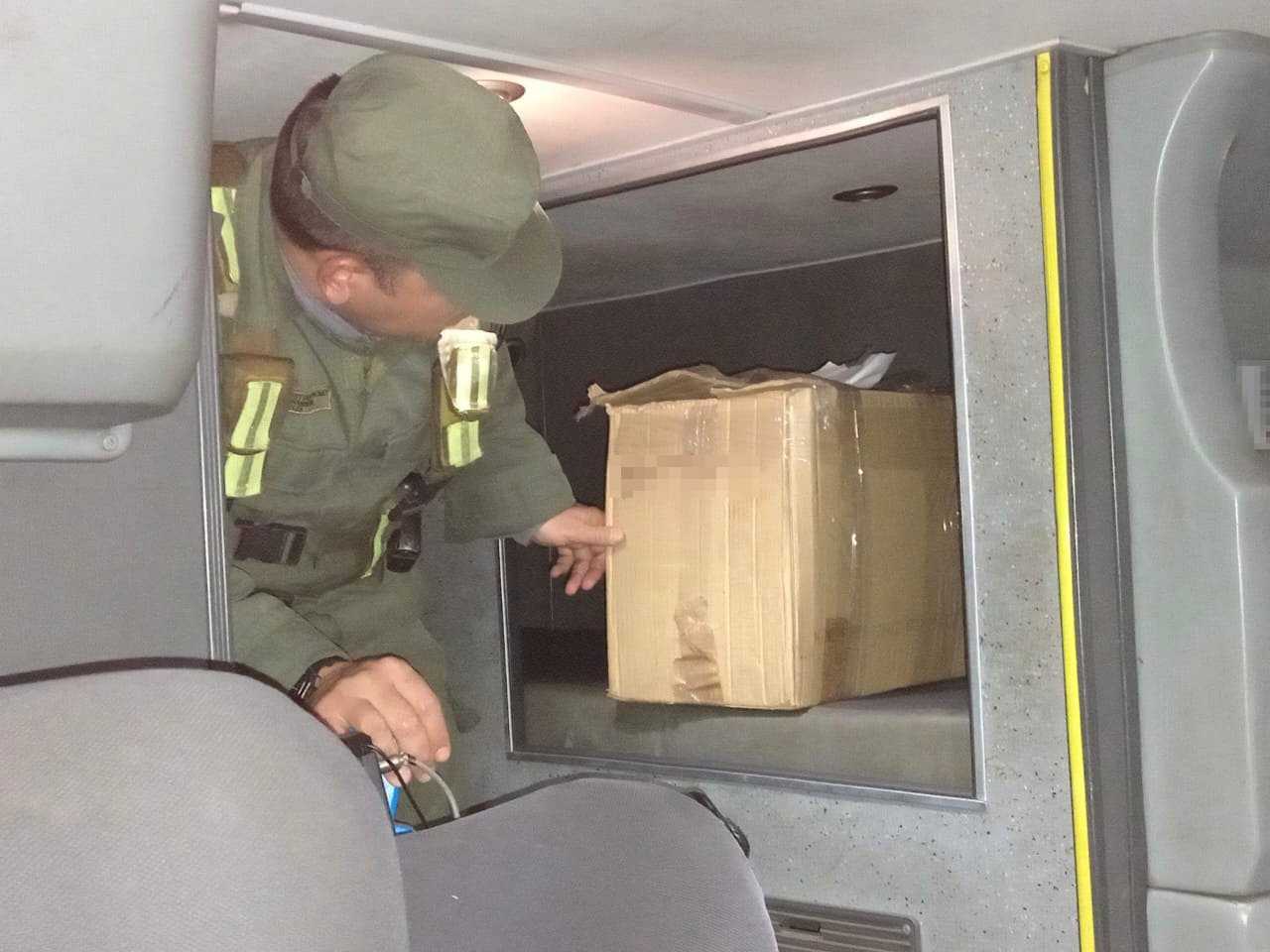Al momento del registro físico de la cabina, en el sector de descanso de los choferes, los funcionarios hallaron una caja que contenía bultos, envueltos en medias y trapos atados con hilos, donde aparentemente se escondían animales.