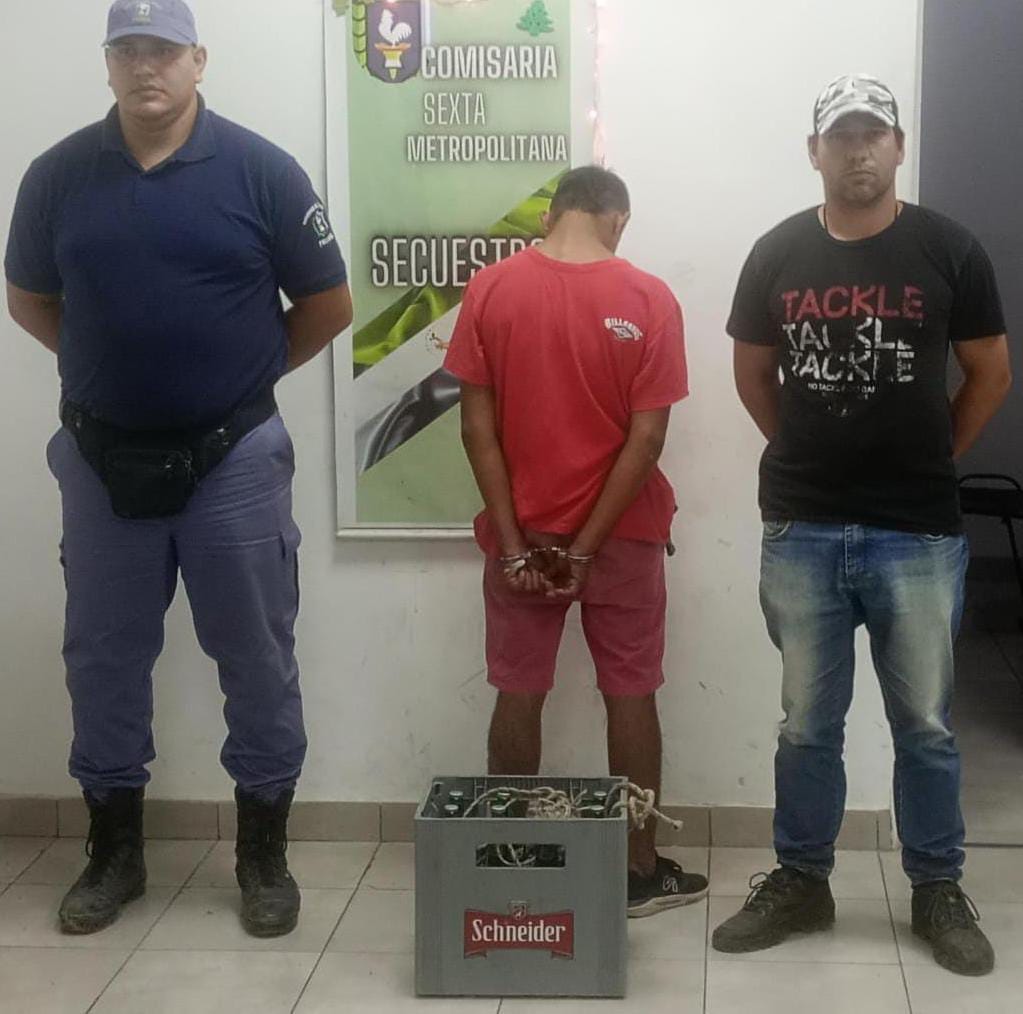 Inmediatamente tomaron intervención y detuvieron a A.A de 27 años y procedieron al secuestro de 1 cajón de plástico con 12 botellas de cerveza y una soga que fue sustraída del interior del comercio que funciona bajo el nombre de Distribuidora Alberdi.