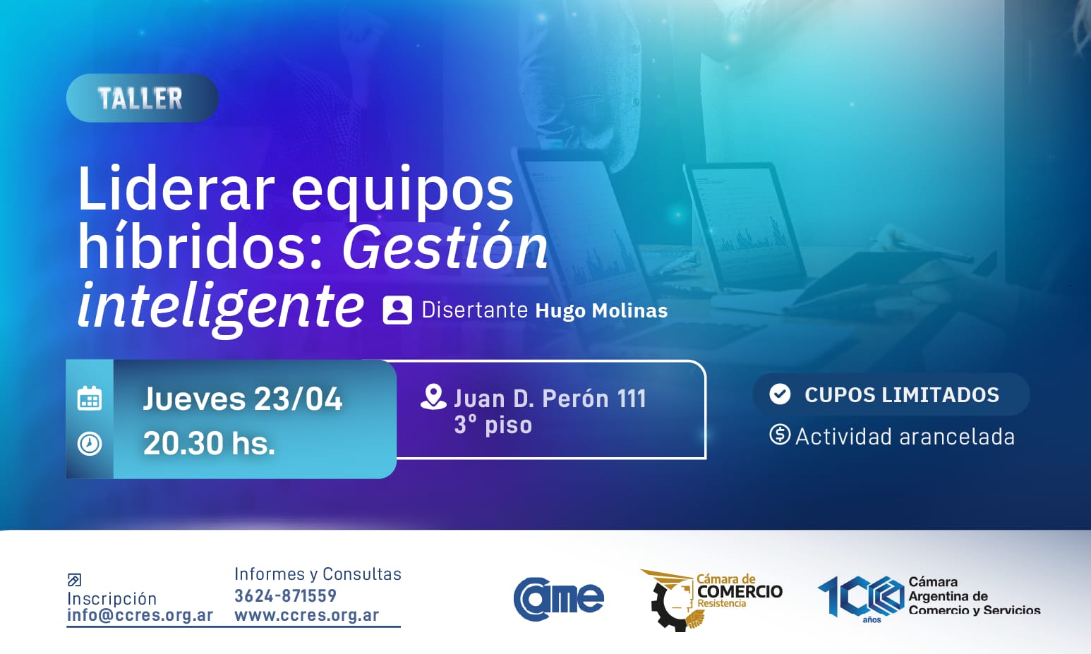 A través de la Secretaría de Capacitación, la Cámara de Comercio de Resistencia invita a participar del curso “Liderar Equipos Híbridos: Gestión Inteligente”, que se llevará a cabo el jueves 23 de abril a las 20.30, en su sede institucional ubicada en Juan D. Perón 111, 3° piso.