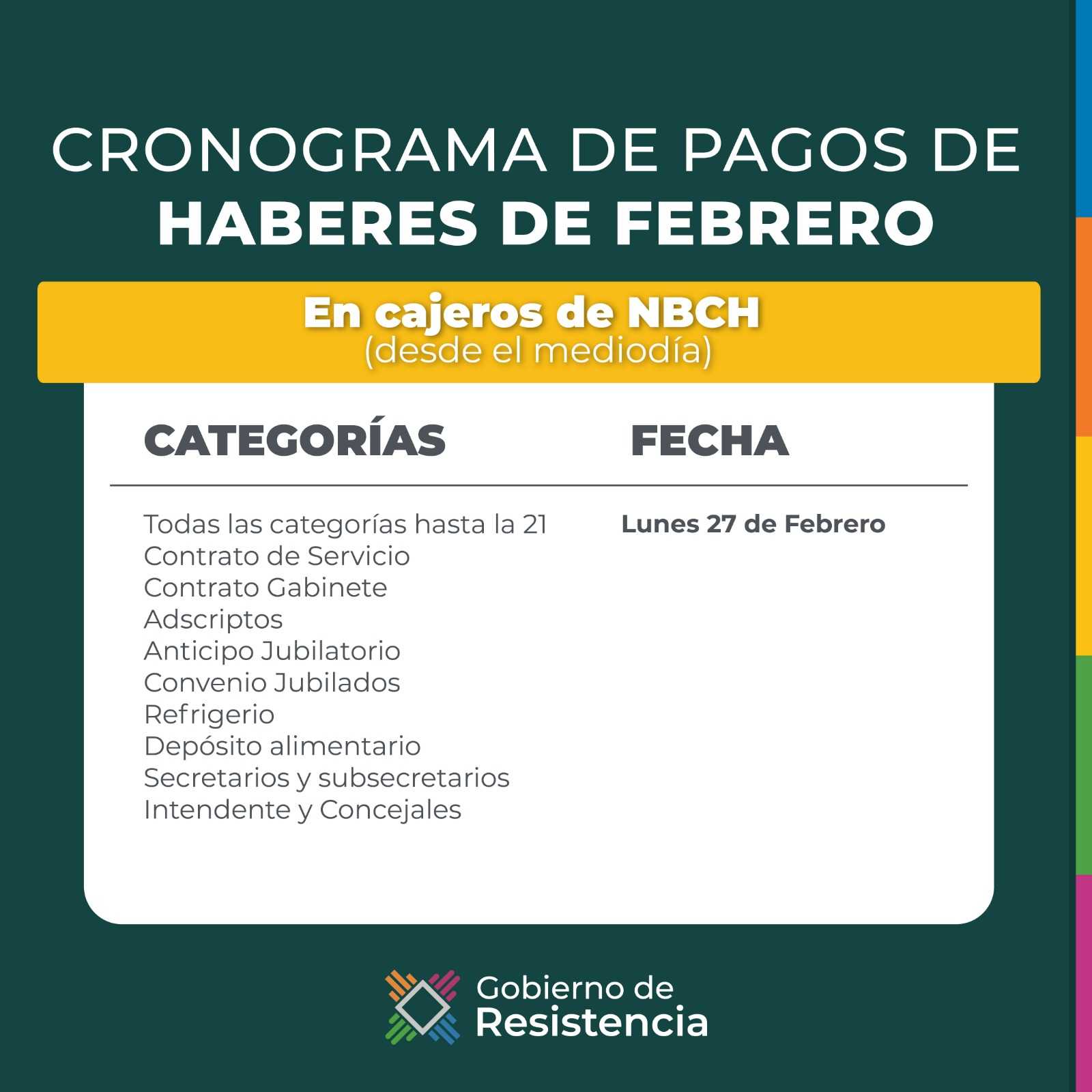 El Municipio de Resistencia abonará este lunes 27 de febrero los haberes de todo el personal municipal, correspondiente al mes en curso. Así, a partir de las 12 horas se depositarán los sueldos en los cajeros electrónicos del Nuevo Banco del Chaco de las categorías 7 a 21; adscriptos; contratados de servicios y de gabinete; anticipos jubilatorios; convenio con jubilados y refrigerio.