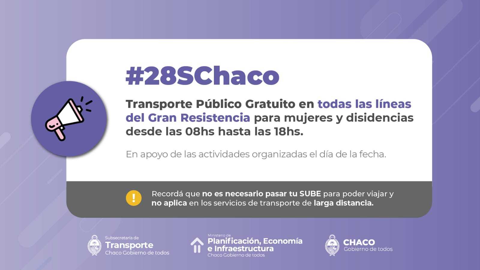 El beneficio aplicará a todas las líneas interurbanas del Gran Resistencia desde las 08 hasta las 18 de este jueves 28 de septiembre. Con esta iniciativa, el Estado busca acompañar estas actividades que tienen por objetivo visibilizar el pedido de mujeres, disidencias y organizaciones en la lucha contra la violencia machista.