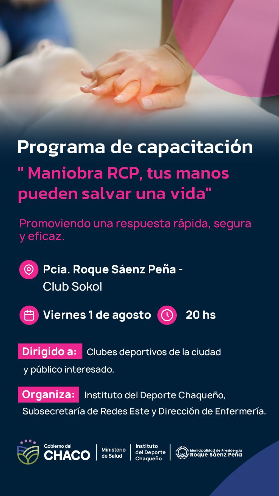 Este viernes 1 de agosto, a partir de las 20 horas, se llevará a cabo una nueva jornada del programa “Maniobra RCP, tus manos pueden salvar una vida”, en el Club Sokol de Presidencia Roque Sáenz Peña.