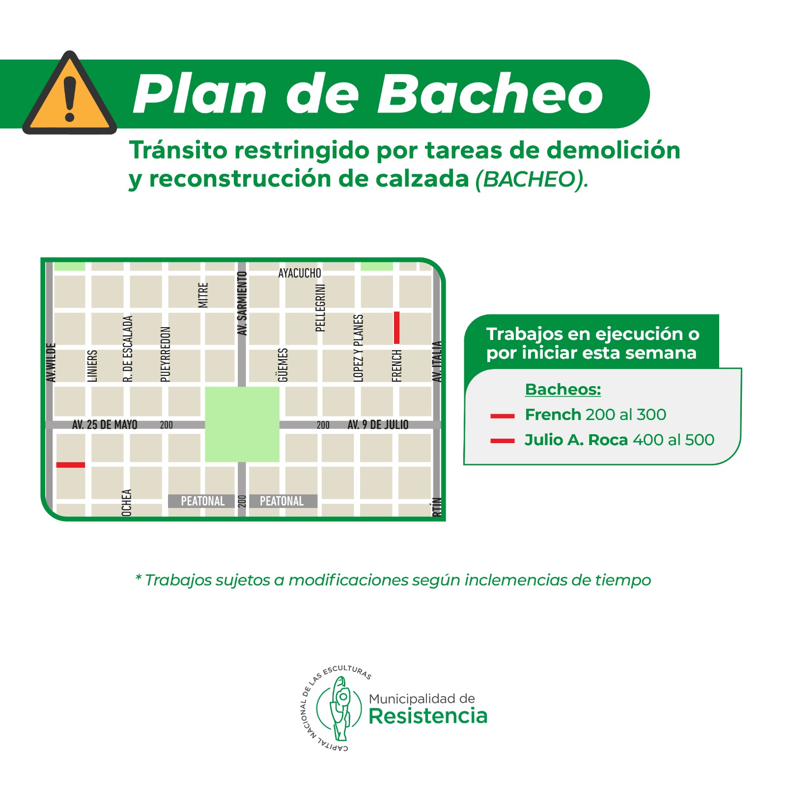 La Municipalidad de Resistencia y la Dirección de Vialidad Provincial, informan la continuidad del Programa de Bacheo 2024 en la ciudad. En tal sentido, se ejecutan tareas de demolición, consolidación de base y colado de hormigón en las calles French, del 200 al 300 y en la bocacalle de Julio A. Roca del 400 al 500.