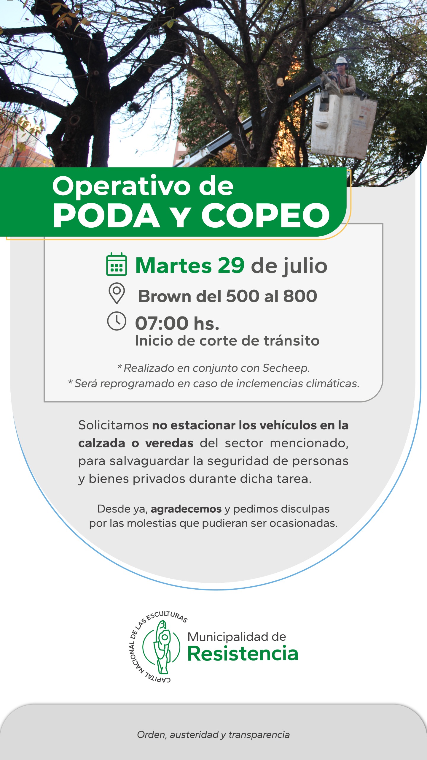 También habrá trabajos de poda este martes 29 en calle Brown y el 31de julio en Hipólito Yrigoyen, en ambos casos del 500 al 800 a partir de las 7 horas.