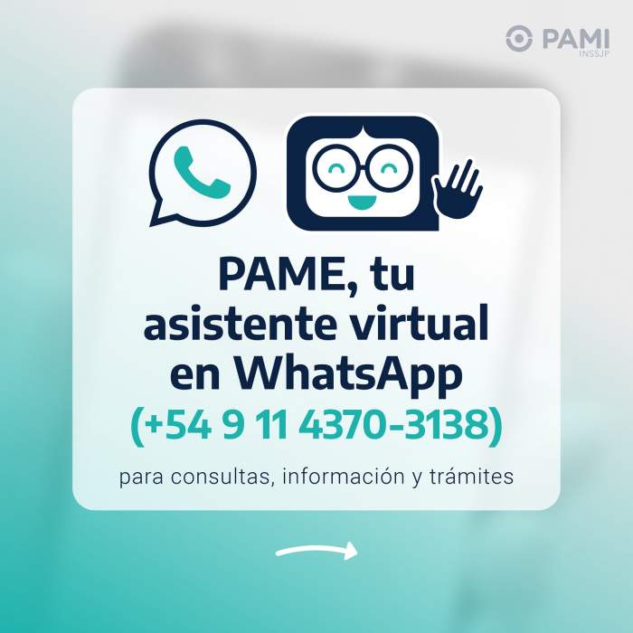 El Gobierno Nacional recordó que se encuentra disponible Pame, el asistente virtual de PAMI en WhatsApp. El bot sirve para realizar consultas sobre trámites, turnos para agencia, servicios y prestaciones, datos de tu médico de cabecera, medicamentos, insumos, entre otras cosas, las 24 horas del día.