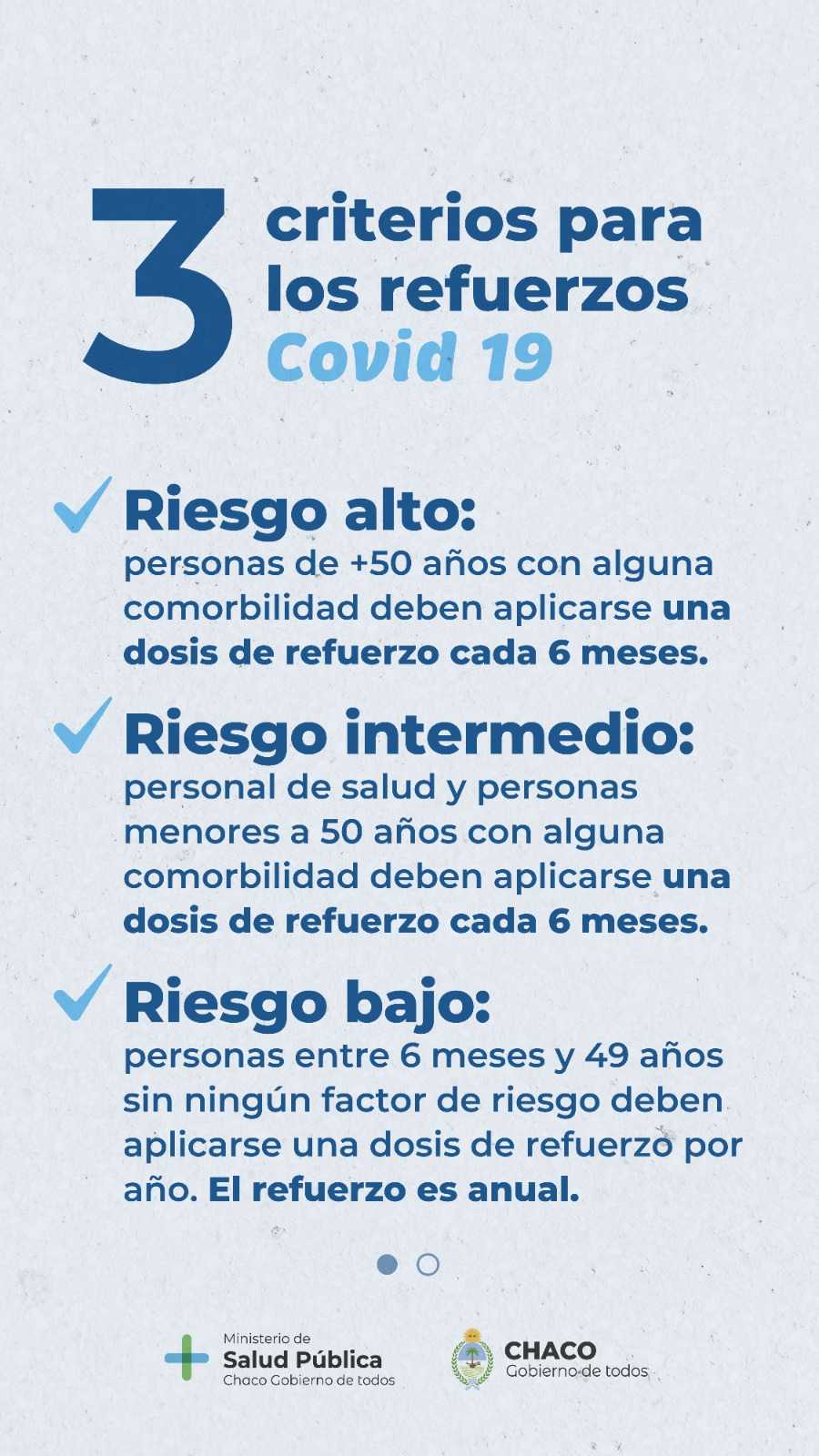 “Debido al significativo incremento de casos positivos, solicitamos a toda la población que se apliquen y completen los refuerzos de vacunas”, insisten. Entre los tres criterios indispensables para aplicarse el refuerzo están, de Riesgo Alto, Riesgo Intermedio y Riesgo Bajo.