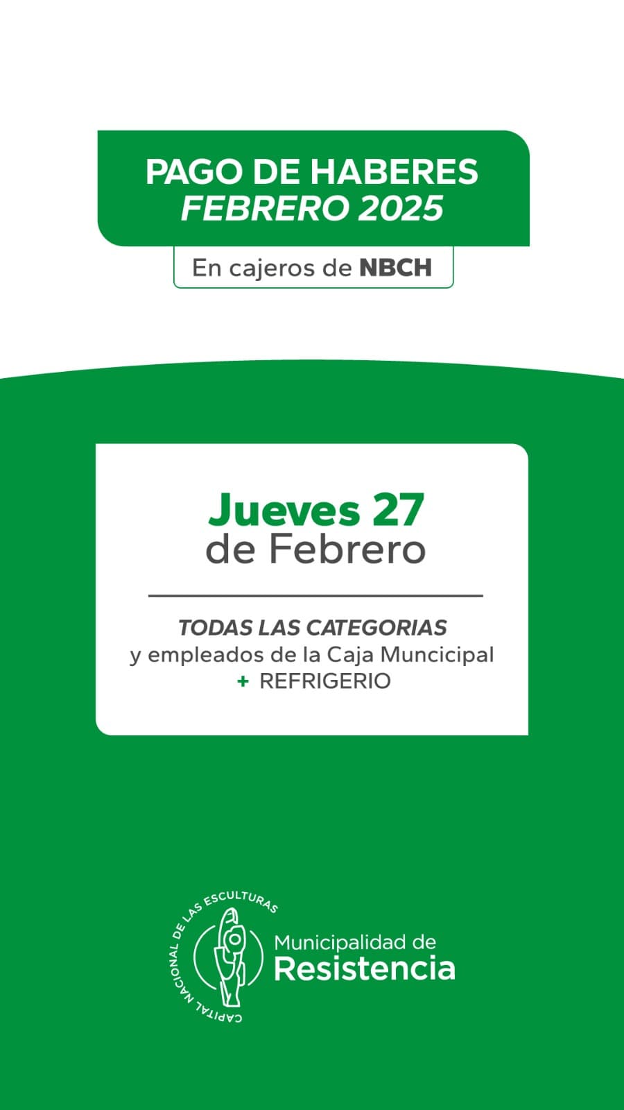 La Municipalidad de Resistencia pagará los sueldos de febrero, el próximo 27 del corriente mes. Está destinado al personal de todas las categorías y de la Caja Municipal. También se abonará el refrigerio de $100 mil.