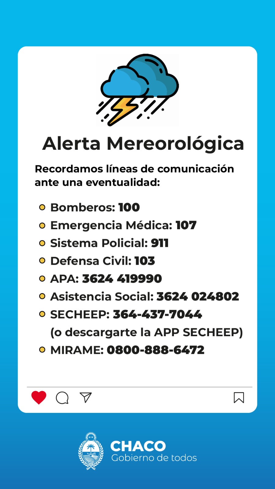 El Gobierno Provincial cuenta con las siguientes líneas de comunicación para que la población pueda utilizarlas ante cualquier eventualidad: Bomberos: 100; Emergencia Médica: 107; Sistema Policial: 911; Defensa Civil: 103; APA: 362 4419990; Asistencia Social: 362 402-4802; Secheep: 364-437-7044; MIRAME: 0800-888-6472.