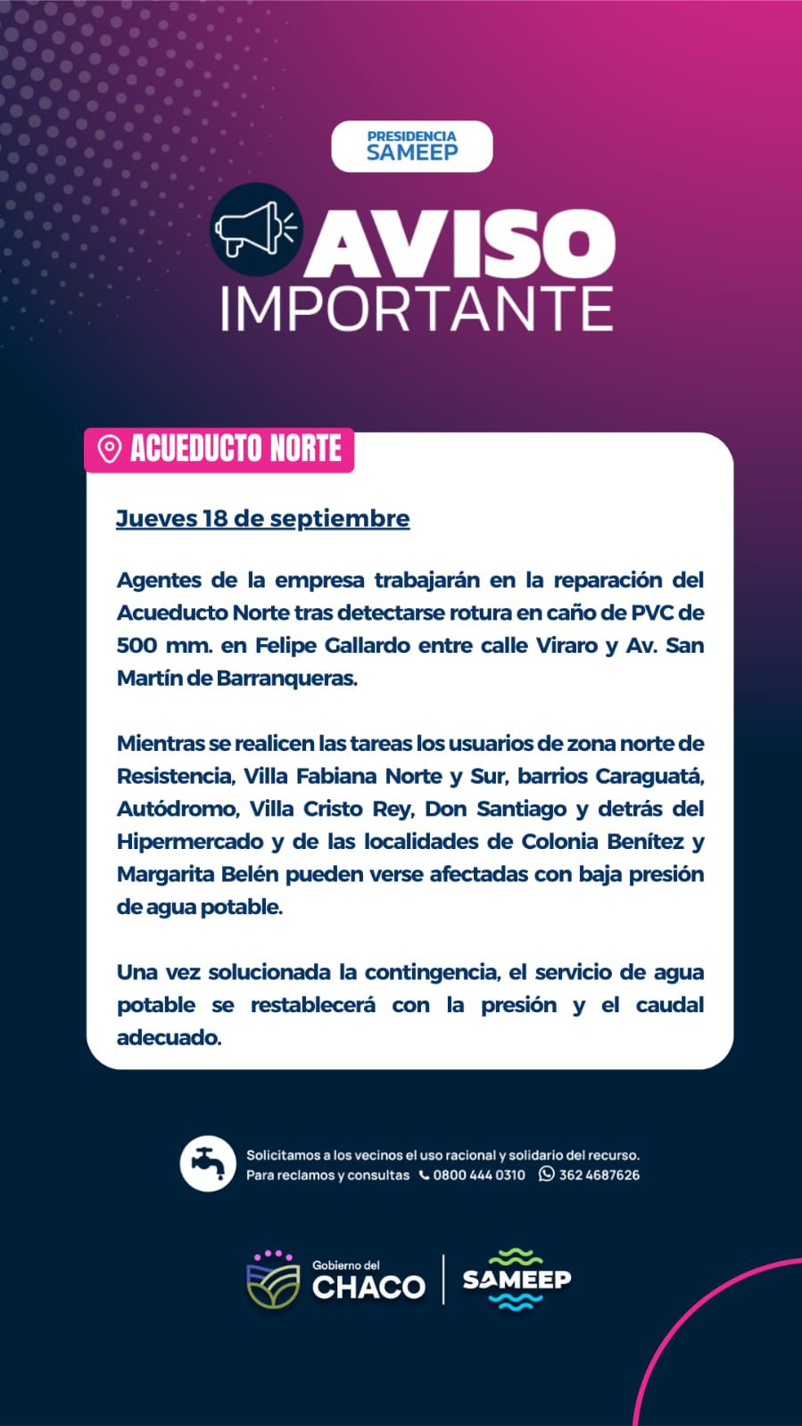 La empresa Sameep informa que, debido a la detección de una rotura en un caño de PVC de 500 mm en la calle Felipe Gallardo, entre Viraro y Av. San Martín de Barranqueras, se realizarán trabajos de reparación en el Acueducto Norte.