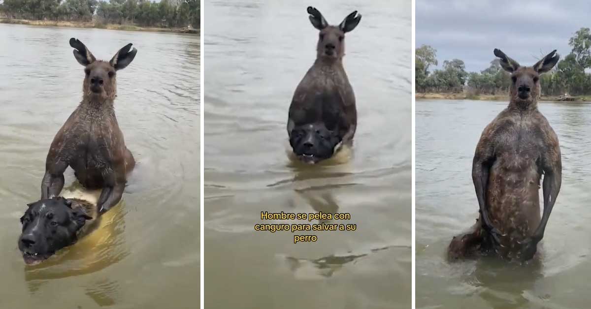 En un video que se viralizó en redes sociales, se puede ver el momento en que el canguro tiene al cachorro, de nombre Hachi, casi sumergido en el agua mientras lo estrangula por la espalda. El hombre que grababa, identificado como Mick Moloney, de inmediato se fue a los golpes para rescatar a su amigo.