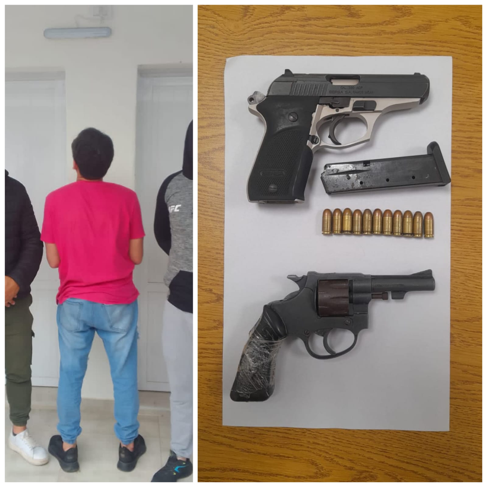 En ambos domicilios el resultado fue positivo y a pedido del Juzgado de Garantías N° 1, se secuestraron dos armas de fuego tipo pistola semiautomática Bersa Thunder 380 cargada con 11 cartuchos y un revolver calibre 22 largo descargado.
